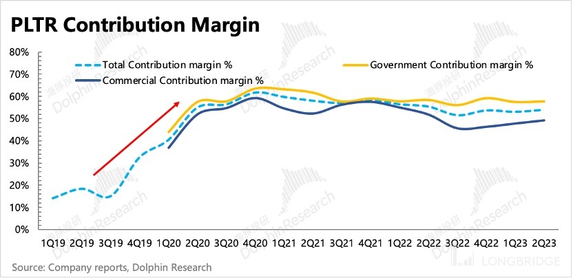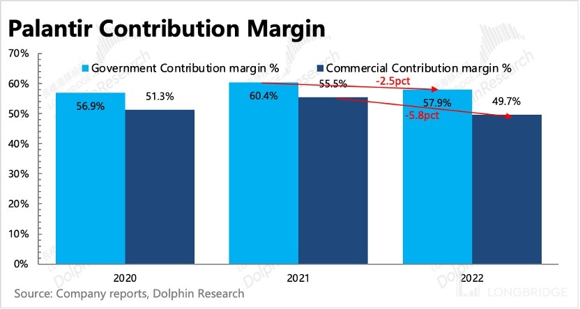 For example, in 2022, while government contracts grew significantly in Palantir and revenue growth picked up, the marginal return on government business did not improve significantly, but instead ended up dragging down the company's overall Contribution margin because of the commercial market's pull.