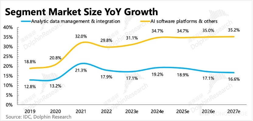 However, the growth prospects of data management and AI platform are much better: 1) Data management and integration will have a 35.6 billion market size in 2022, with CAGR expected to reach 18% in the next five years and expected to expand to 80.7 billion in 2027, doubling growth. 2) AI platform should be the "most beautiful boy" to grow in the next five years. It will only exceed 20 billion in 2022 and is expected to reach 87 billion in 2027, with an annual CAGR of 34%.