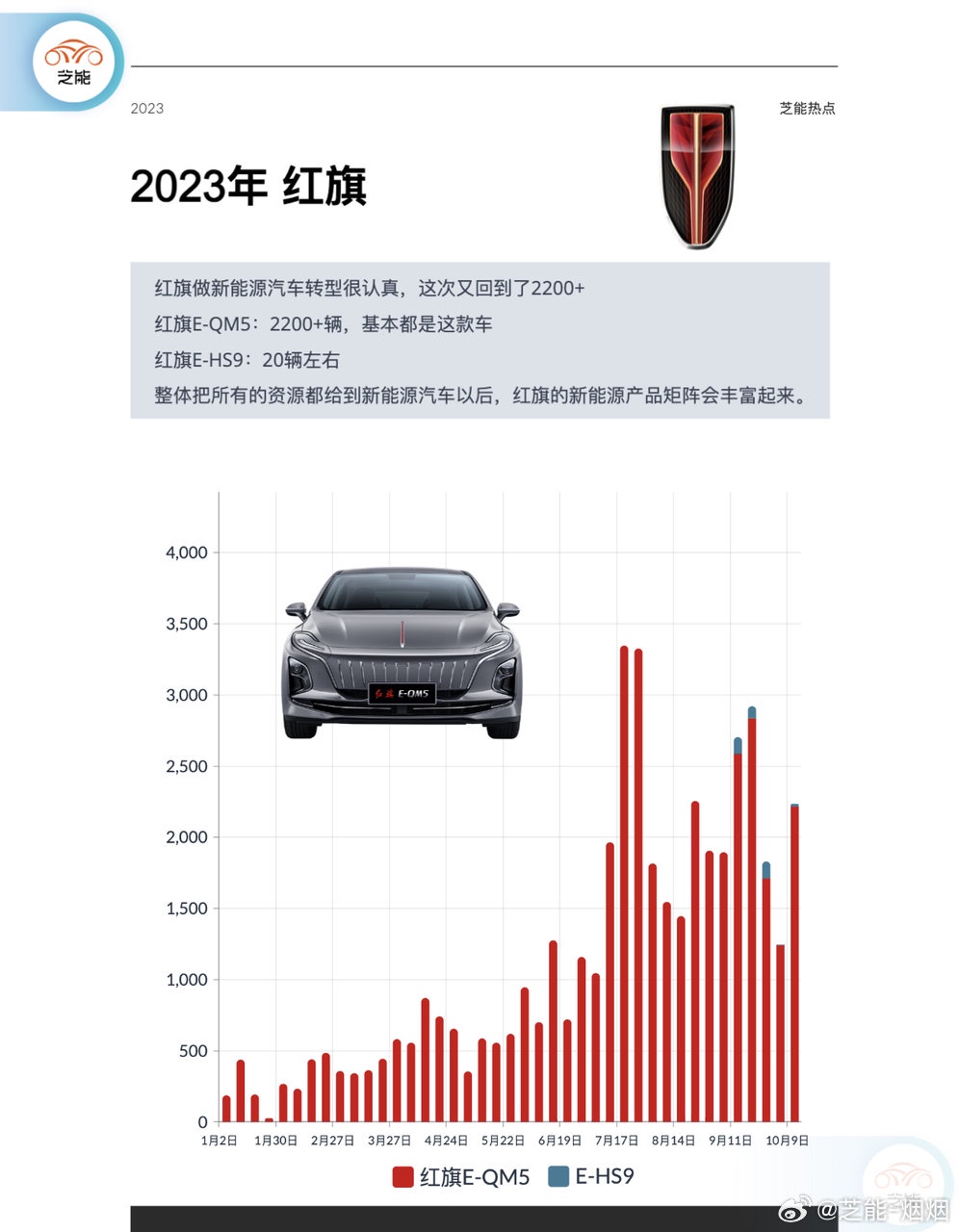红旗做新能源汽车转型很认真,这次又回到了 2200+ 红旗 E-QM5:2200+ 辆,基本都是这款车红旗 E-HS9:20 辆左右整体把所有的资源都给到新能源汽车以后,红旗的新能源产品矩阵会丰富起来。