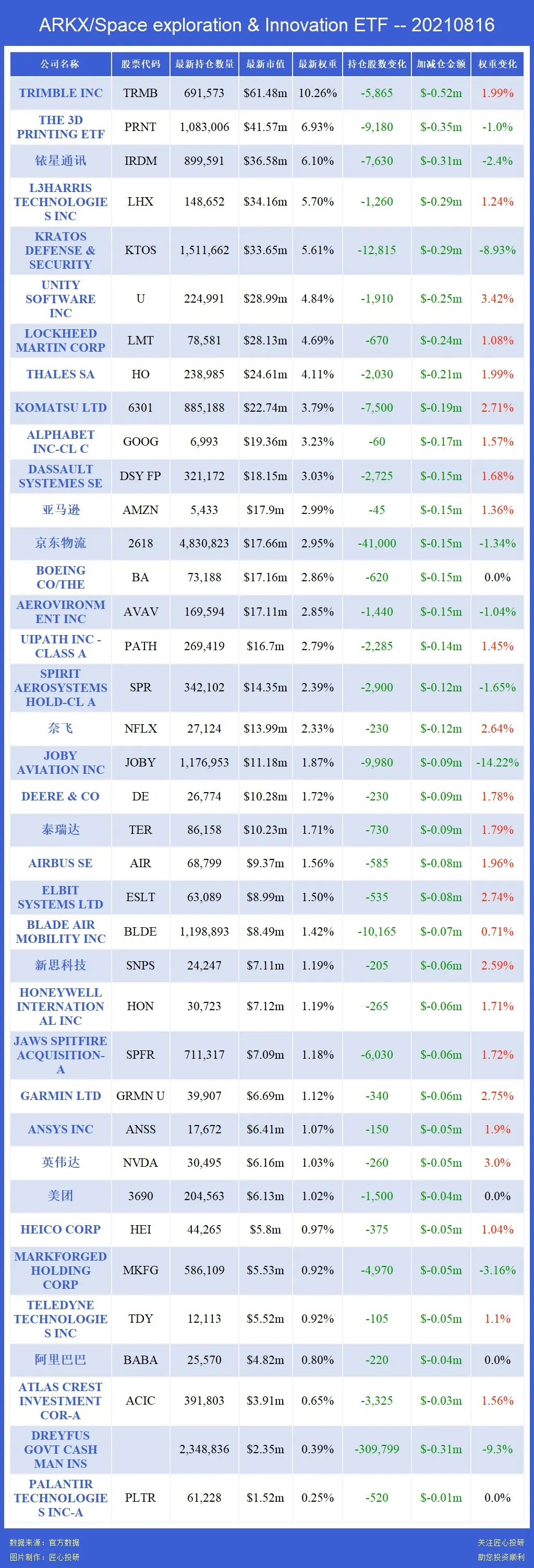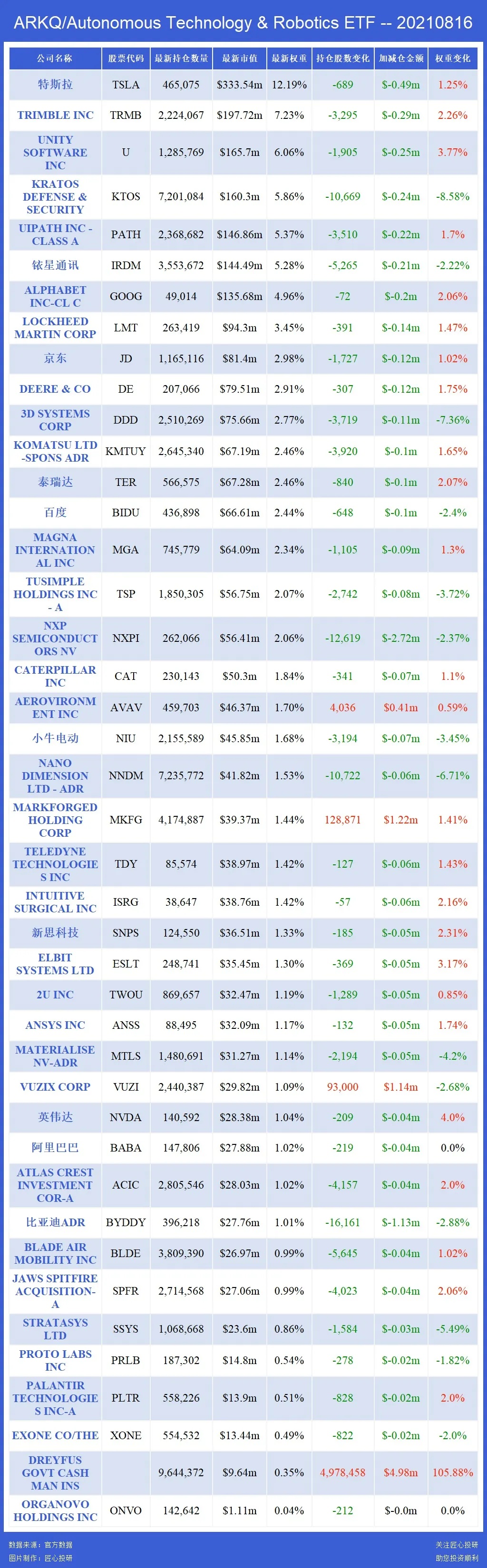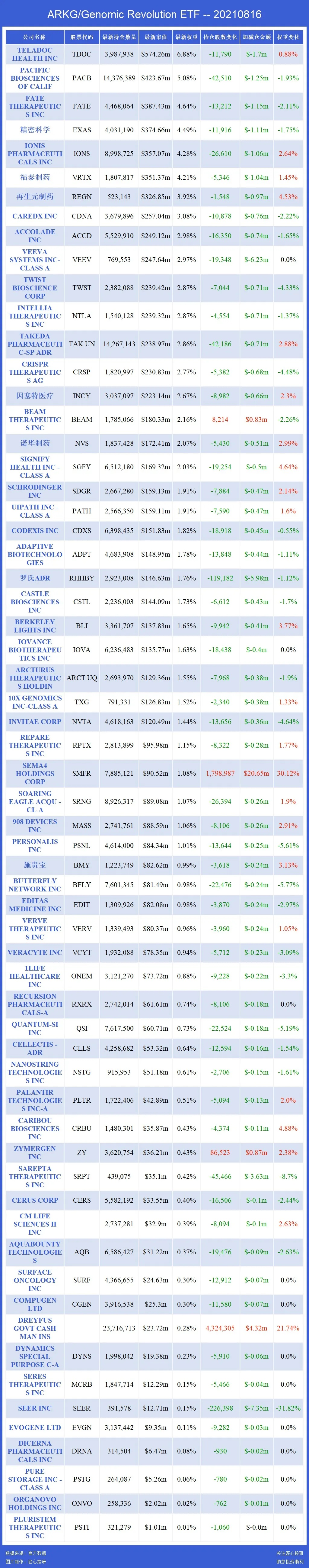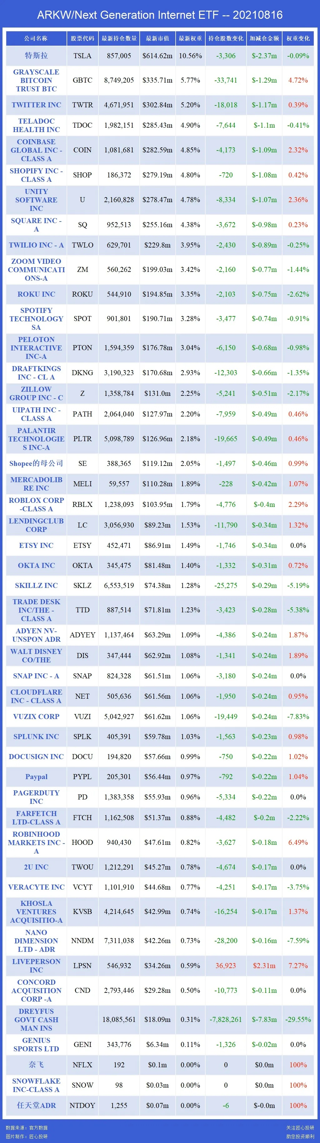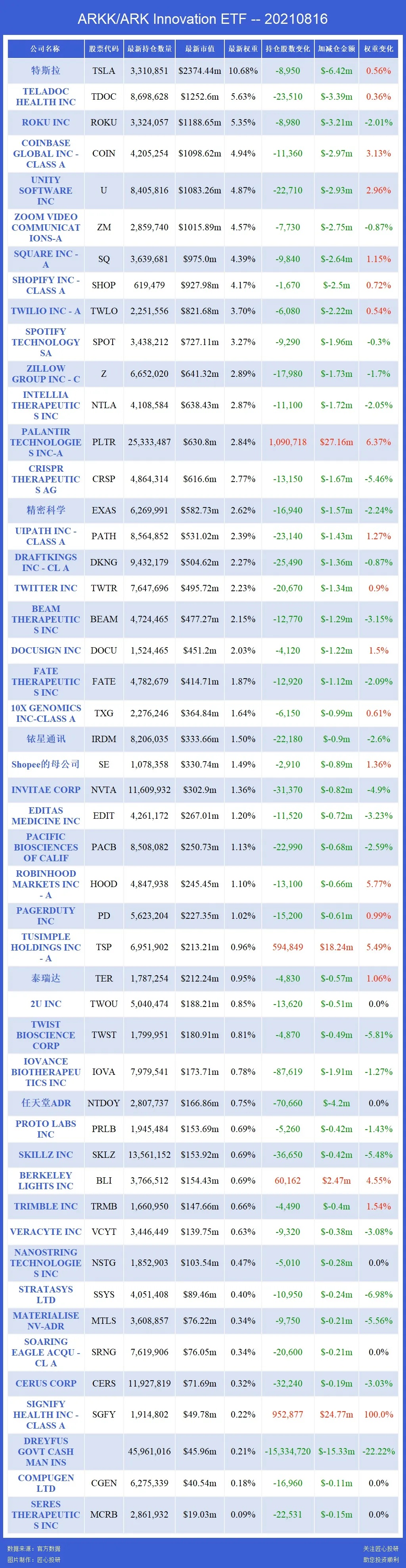 关注匠心投研,助您投资顺利,ARK 基金每天都会追踪!