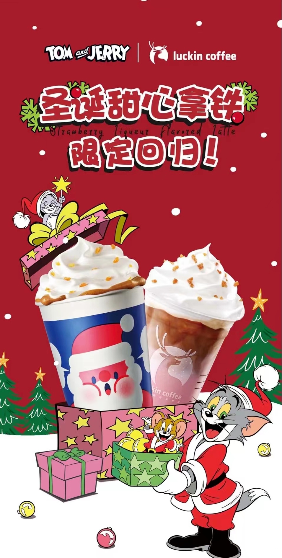 在跨界营销上已经得心应手的瑞幸咖啡,不会放过任何一个可以 “搞事情” 的节日。最近,瑞幸宣布和 “TOM and JERRY” 再次联名,推出联名新品 “圣诞甜心拿铁”。这次没有联名纸杯,但杯套上印有圣诞树、猫和老鼠等元素。与 “圣诞甜心拿铁” 同时推出的还有另外 3 款饮品以及 3 款甜品。