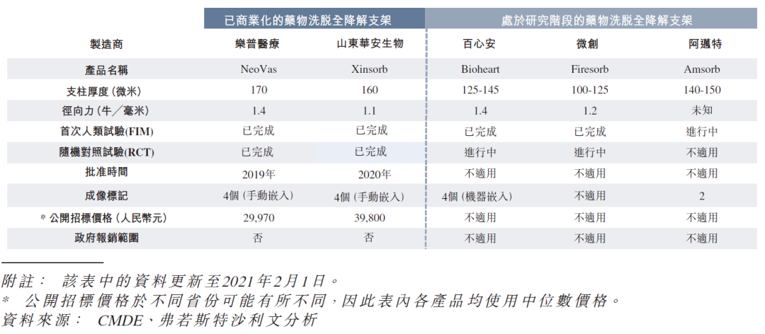 于全球市场中,截至 2021 年 2 月 1 日,共有三款全降解支架产品已获准在欧洲进行商业化,包括两款第一代产品(Biotronik 的 Magmaris 及 Elixir Medical 的 DESolve)及一款第二代产品(Meril 的 MeRes 100),惟有关产品根据随机对照临床试验的临床试验结果并无获得任何监管批准。Meril 的 MeRes100 及 Elixir Medical 的 DESolve 均于支架使用 PLLA 物料。于全球市场中,亦有另外两款由国际参与者制造的第二代开发中全降解支架在研产品,有关产品于截至 2021 年 2 月 1 日并未报告展开随机对照临床试验。根据弗若斯特沙利文的资料,基于目前的开发情况,Bioheart®预期将为全世界第一款基于多中心随机对照临床试验结果获得监管批准的第二代全降解支架系统。