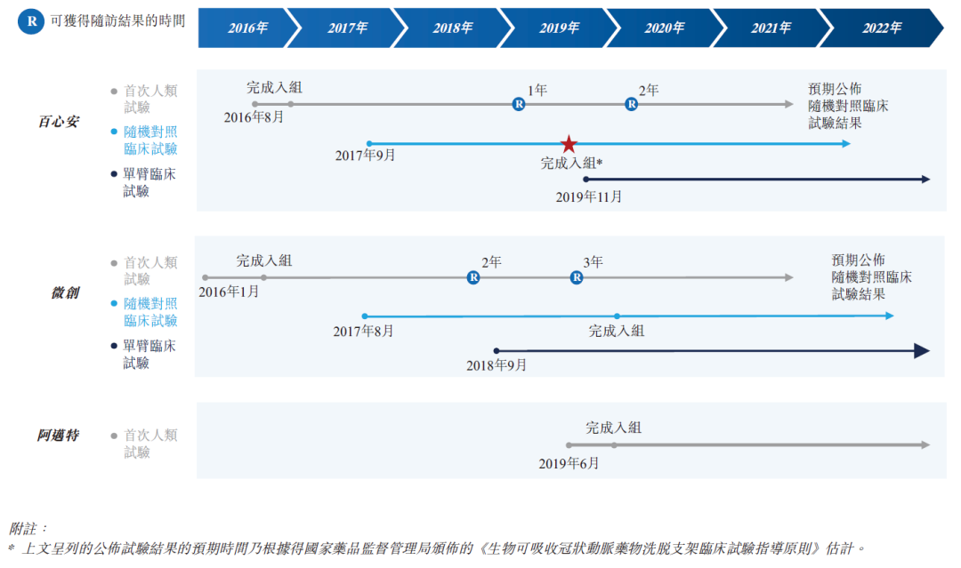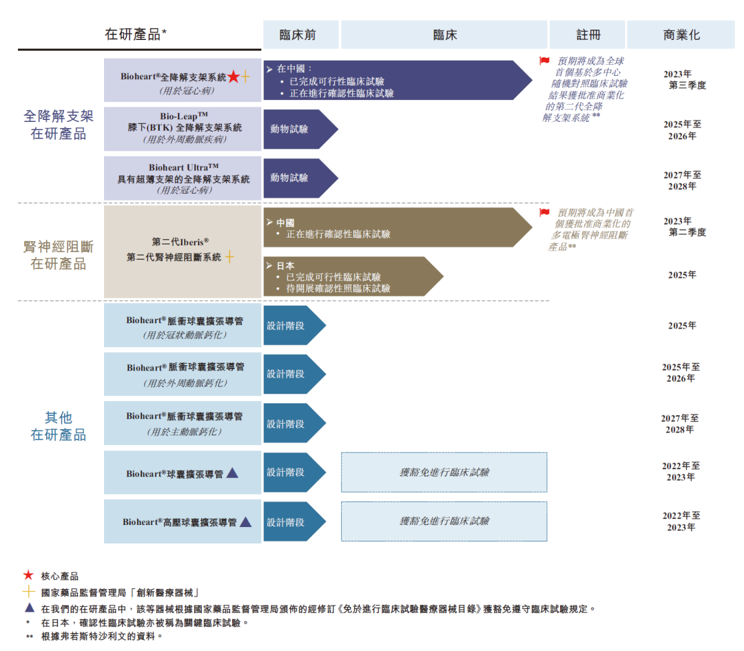 Bioheart®是于治疗冠状动脉疾病的经皮冠状动脉介入治疗手术中使用的自主研发全降解支架系统。根据弗若斯特沙利文的资料,截至最后实际可行日期,中国仅有两款已商业化的全降解支架产品,且均为第一代全降解支架产品(支柱厚度超过 150 微米)。根据弗若斯特沙利文的资料,我们是中国仅有的三家拥有处于临床试验阶段的第二代全降解支架产品的国内公司之一,而 Bioheart®预期将成为世界上首个基于多中心随机对照临床试验 (RCT) 结果获得监管批准的第二代全降解支架系统。Bioheart®获国家药品监督管理局认可为「创新医疗器械」,因而合资格进入快速审批通道。我们须于申请国家药品监督管理局批准之前完成 Bioheart®的确认性临床试验,包括随机对照临床试验及单臂临床试验 (SAT)。我们于 2019 年 8 月完成随机对照临床试验受试者入组及于 2021 年 4 月展开单臂临床试验。我们预期于 2021 年底前完成单臂临床试验的受试者入组,于 2022 年底前完成所有必要的随访,且于 2023 年第三季度就 Bioheart®获得国家药品监督管理局的批准。除我们的核心产品外,我们亦正在开发用于治疗冠状动脉疾病的具有超薄支架的下一代全降解支架产品 BioheartUltra™,以及用于治疗膝下 (BTK) 外周动脉疾病的全降解药物洗脱支架系统 Bio-Leap™。我们计划于 2022 年开展 Bio-Leap™及 BioheartUltra™的临床试验,且目前预期将分别于 2025 年及 2027 年或前后在中国推出产品。