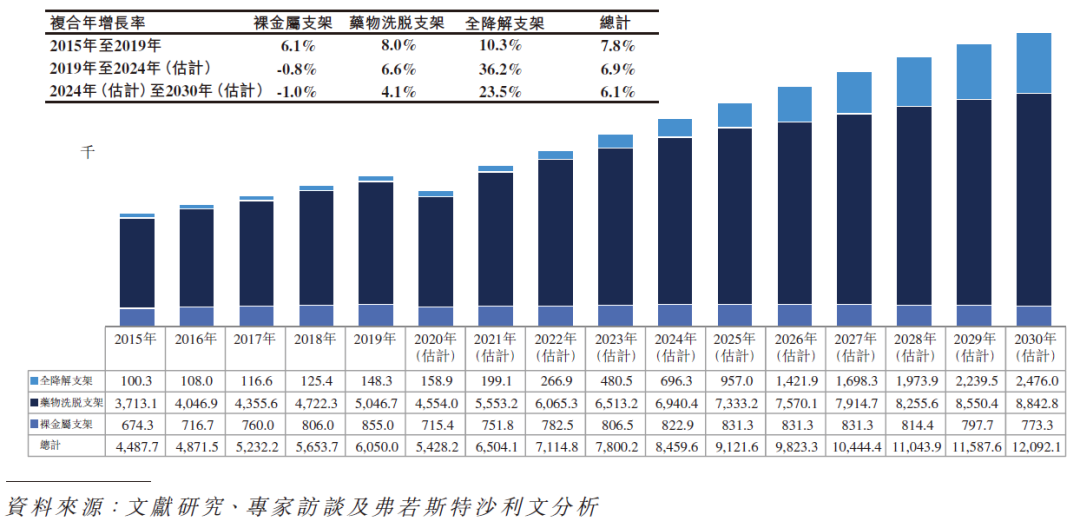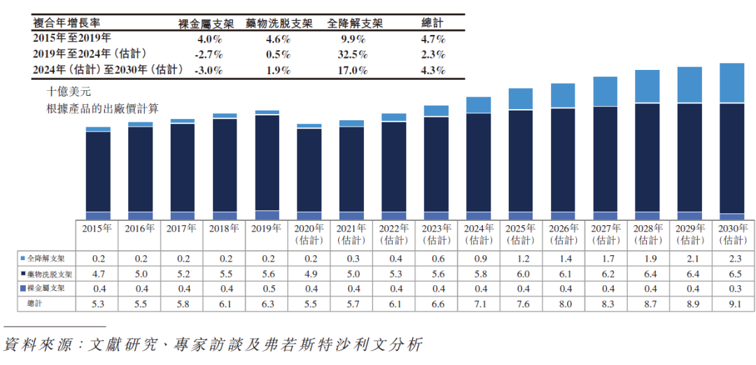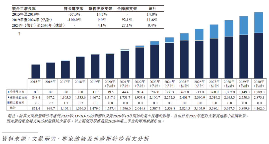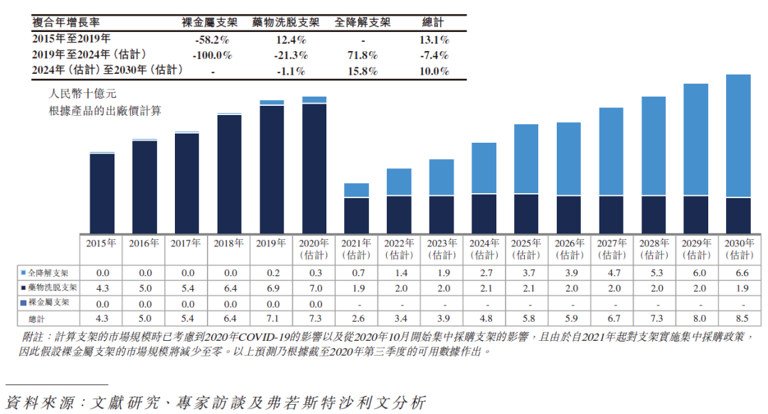 于目前可用于中国经皮冠状动脉介入治疗手术的三类支架(即裸金属支架、药物洗脱支架及全降解支架)中,裸金属支架指老一代的支架,已逐渐被药物洗脱支架及全降解支架取代。诚如上表所阐述,用于中国经皮冠状动脉介入治疗手术的裸金属支架数目于 2015 年至 2019 年减少 57.3%,预期将于未来十年进一步减少。药物洗脱支架为目前用于中国经皮冠状动脉介入治疗手术的主流支架,随着中国对经皮冠状动脉介入治疗手术需求的增加,预期用于经皮冠状动脉介入治疗手术的药物洗脱支架数量将会持续增加。然而,由于中国政府于 2020 年新采纳并适用于药物洗脱支架的集中采购政策所影响,药物洗脱支架于中国的市场规模预计于 2020 年至 2021 年下跌 72.9%,且预期于未来十年不会出现任何重大增长,主要由于集中采购导致药物洗脱支架产品的价格大幅下降。集中采购政策的目的是让更广泛的患者能够获得药物洗脱支架。然而,由于价格大幅下降,预期众多药物洗脱支架制造商将倾向开发及生产更创新及具有较高利润率的高端医疗器械,并减少彼等于开发、制造及推广其药物洗脱支架产品的投资,而于经皮冠状动脉介入治疗手术中使用的药物洗脱支架数量增加未必能弥补价格大幅下降为药物洗脱支架市场规模带来的负面影响。相反,预期制造商、分销商及其他相关行业参与者将更有动力推广全降解支架产品。因此,预计全降解支架将较药物洗脱支架处于更有利位置可把握中国经皮冠状动脉介入治疗器械市场的增长潜力。