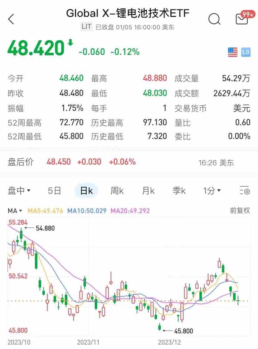综合基本面和技术面分析,LIT 作为跟踪全球锂矿产业的 ETF,受到电动汽车和可再生能源需求的推动。尽管 LIT 的价格在过去一段时间内呈上升趋势,但近期出现的反转迹象可能表明市场情绪正在转变。然而,投资者应该密切关注锂市场的供需平衡、技术创新、政策变化和全球经济情况等因素对 LIT 价格的影响。$Global X Lithium & Battery Tech(LIT.US)