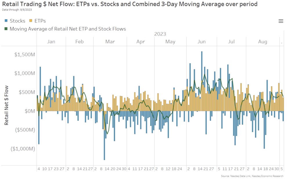 散户在卖出更多的公司股票,但这并不意味着其资金在流出投资组合。散户投资者一直在 ETF 方面维持净买入水平。