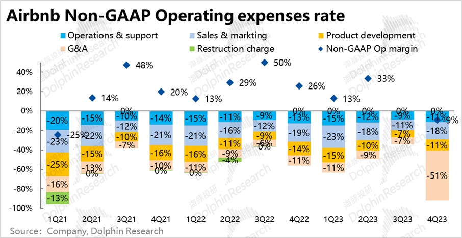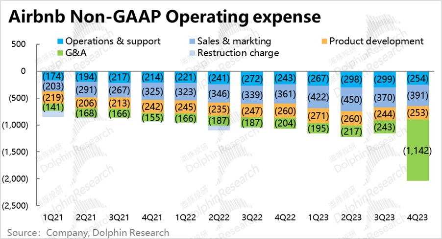 Limited improvement in monetization rate, and no surprises in revenue gross margin: In terms of revenue, Airbnb's revenue for this quarter was approximately $2.2 billion, slightly better than expected. In terms of trends, the revenue growth rate also decreased by 1% compared to the previous quarter, reaching 17%, and did not reverse the trend of slowing growth in booking value. The similar trend in changes in revenue growth rate and booking value indicates that Airbnb's monetization rate has not changed much. The monetization rate for this quarter was 14.2%, a slight increase of 0.2% year-on-year, resulting in a slight increase of less than 1% in the company's gross margin, ultimately achieving a gross profit of approximately $1.83 billion, which roughly met expectations.