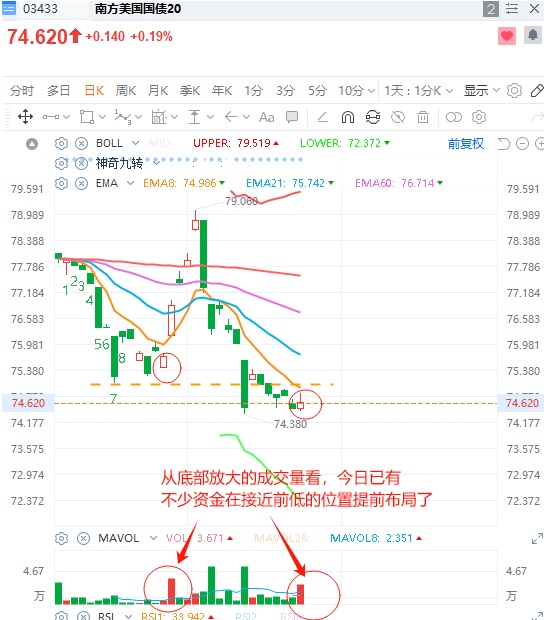 从截图成交量看,今日已经有不少看好的资金在接近前低 74.38 的位置提前布局了南方美国国债 20ETF。