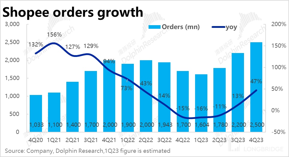 Breaking down the price and volume, the growth rate of order volume this quarter reached a staggering 46%, reflecting Sea's strong growth in the absence of TT Shop, despite the favorable low base from last year.