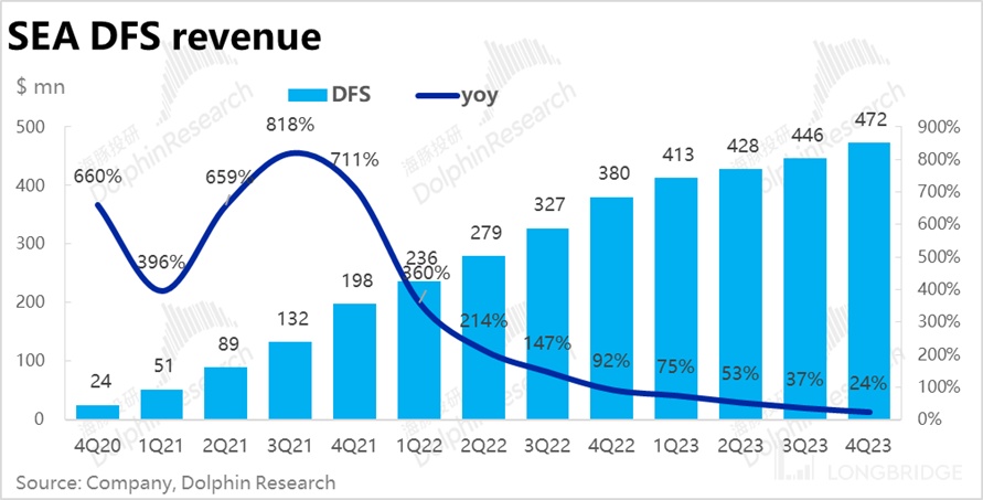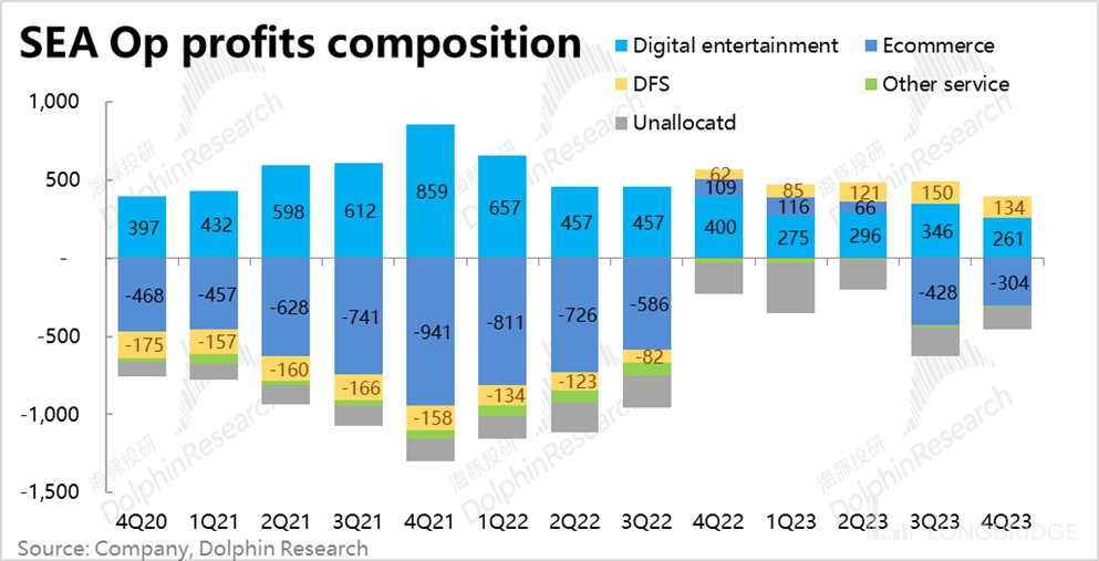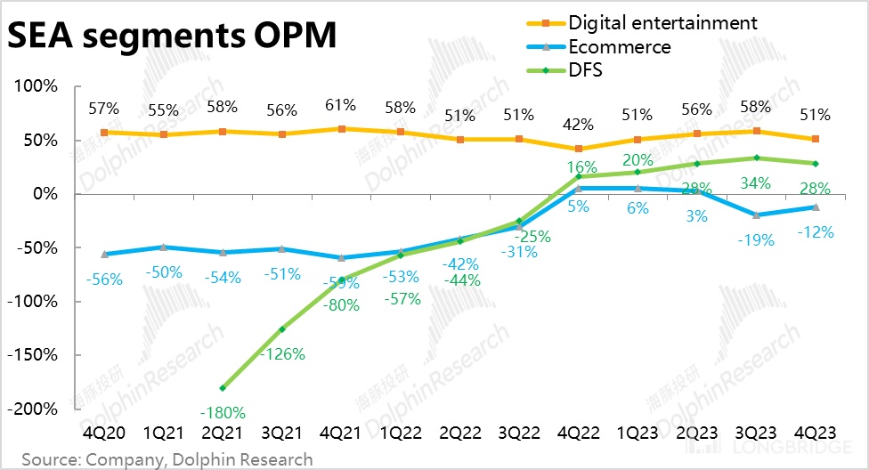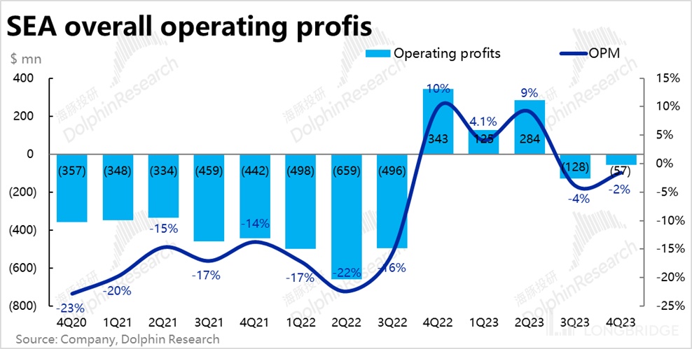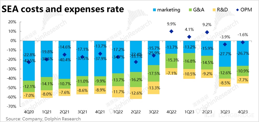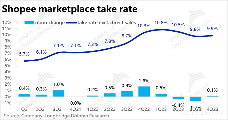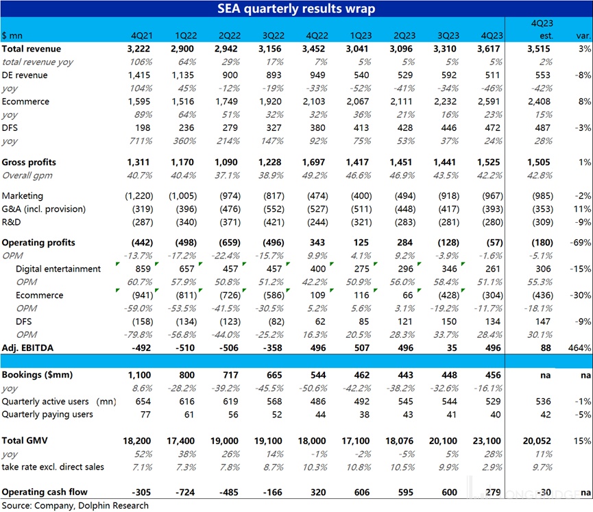 The company claims that in addition to strong GMV growth, the continued improvement in Sea's core marketplace monetization rate in the fourth quarter is also positive news. According to calculations, the monetization rate of the core marketplace increased by 0.1 percentage points to 9.9% MoM. Dolphin Research believes that this is partly due to the absence of TT Shop, and other major players in the market are also improving monetization, creating good opportunities.