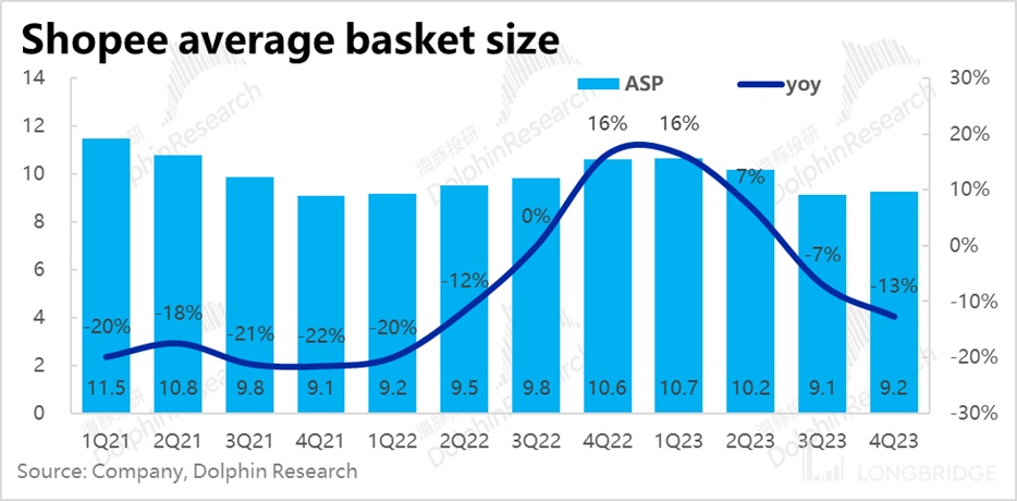 Breaking down the price and volume, the order volume in this quarter surged by 46%, while the average unit price decreased by 13% year-on-year to $9.2. It can be seen that Sea opted for low-price promotions to drive traffic and seize market share during this window of opportunity.