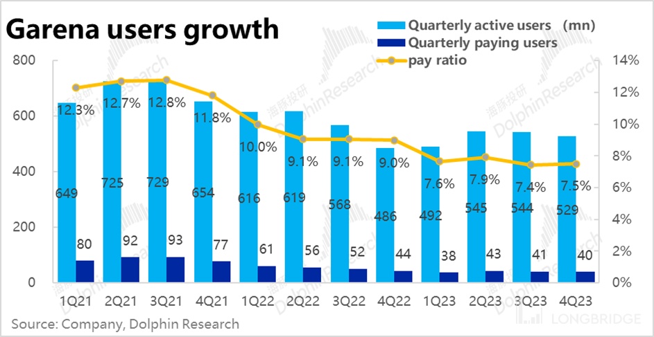 2. New Game Release, Can Garena's Bottoming Period End? User data continues to decline, with a decrease of approximately 15 million active users and a slight decline of 1 million paying users compared to the previous quarter. However, the year-on-year decline in revenue has narrowed to 16% as it passes through the high base period, with a 1.7% increase compared to the previous quarter. Although still at the bottom, there are initial signs of a turnaround.