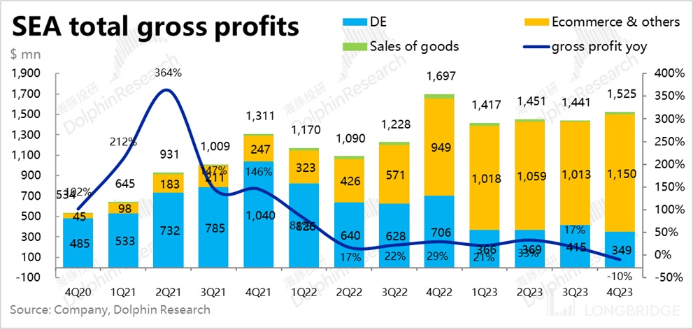 After analyzing the performance of the three core businesses mentioned above, Sea achieved a total revenue of 3.62 billion this quarter, exceeding market expectations by 3%, mainly driven by the e-commerce sector's performance as seen earlier. At the gross profit level, due to the new game investment in the Garena sector and the downward pressure on the gross profit margin of the e-commerce sector during the low-price promotion period, the company achieved a gross profit of 1.53 billion in the fourth quarter, a 10% decrease compared to the same period last year, but it met expectations.
