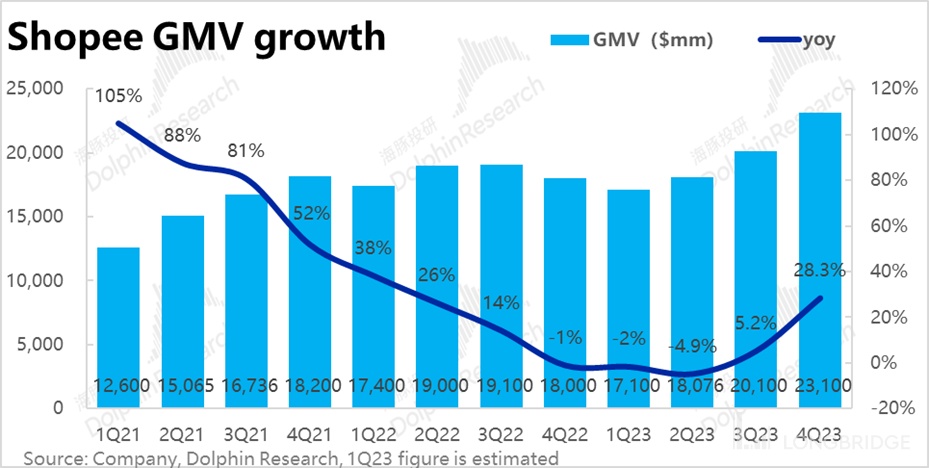 As a result, in the fourth quarter, Sea achieved a GMV of $23.1 billion, with a year-on-year growth rate as high as 28%, far exceeding market expectations. Although the expected growth rate by major analysts closely tracking the company is generally between 20% to 25%, the actual growth rate still beat expectations.