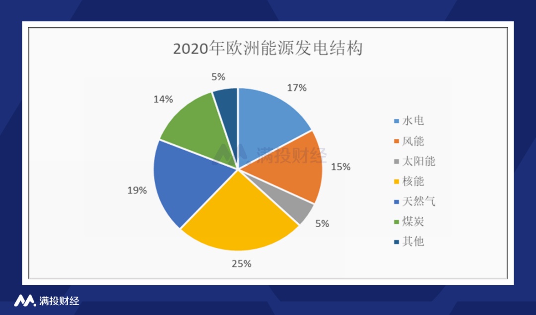 此次的危机主要围绕化石能源短缺和欧洲能源结构转型之间的矛盾展开。随着环境气候问题愈加严重对人类生存造成威胁,全世界正经历能源转型,以清洁能源代替化石能源,欧洲也不例外。欧洲在呼吁能源绿色转型上走在世界前列,其电力供应结构正从煤炭向天然气、海上风电、核能发电等转型,根据《欧洲发电组合 2020 年度报告》显示,2020 年可再生能源发电占欧洲全部电力的 41%。