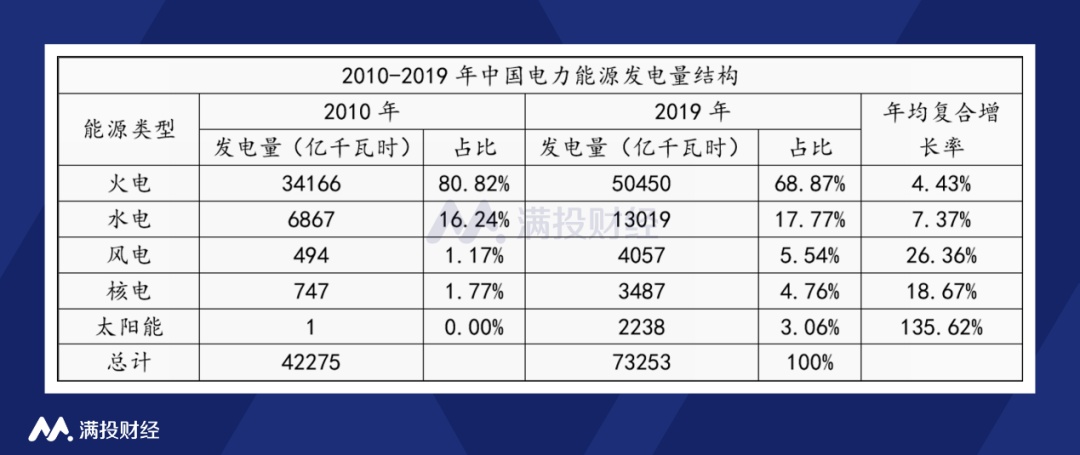 我国当前的电力发电能源结构的变化,仍以火力发电为主,2019 年我国火力发电量为 50450 亿千瓦时,占比达到 69%。但从 2010 年至 2019 年中国电力能源发电结构的变化来看,我国火力发电的比重下降明显,年复合增长率为所有能源发电类型中最慢,同时清洁能源的发电量和比重明显提升。