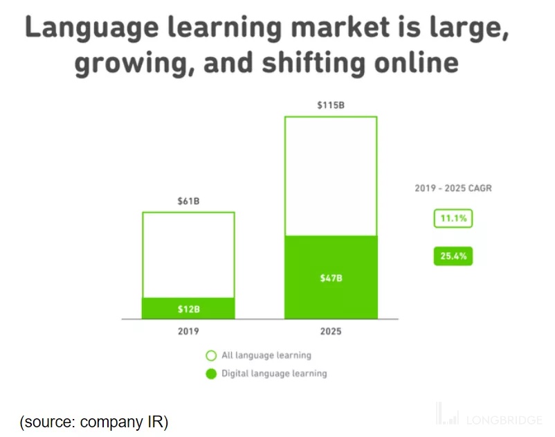 退一步说,这是教育中一个很有吸引力的部分。到 2025 年,全球语言学习市场预计将达到 1,150 亿美元,而 2019 年为 610 亿美元。在这一数字中,Duolingo 得益于其在在线类别中的地位,预计到 2025 年,该公司将继续以 25.4% 的复合年增长率快速增长。