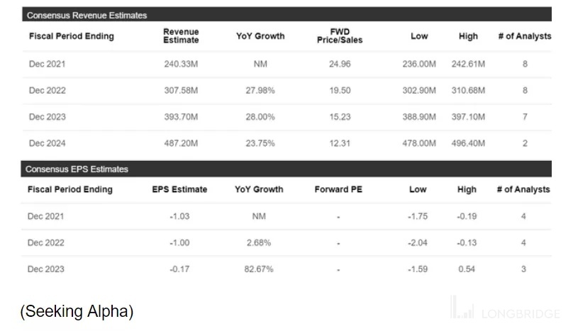 根据共识估计,2021 年的收入预测为 2.4 亿美元,与管理目标一致。展望未来,预计 2022 年和 2023 年的收入将增长 28%,2021 年的收入将增长一倍,至 2024 年的 4.87 亿美元。市场还预计,在可预见的未来,利润将保持为负值,但随着时间的推移,随着公司从规模中获益,盈利将呈现出较低的趋势。相比之下,预计今年每股收益为负-1.03 美元;到 2023 年,市场预期的损失较小,为-0.17 美元。