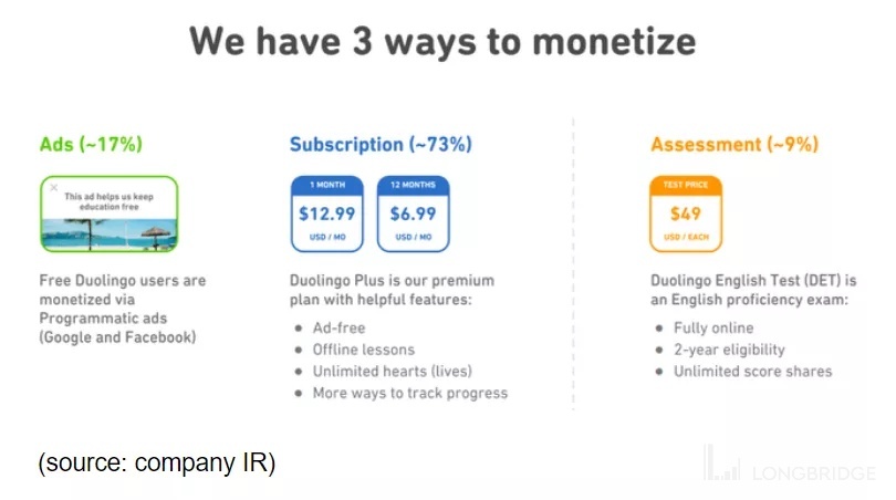 更重要的是,该公司能够将这波平台流量转化为付费用户,该用户达到 190 万,比去年的 130 万增加了 46%。换句话说,发现 “多邻国” 应用程序的用户可以通过广告支持的版本立即使用其基本功能,而越来越多的用户正在转换为高级服务。目前,订阅占总收入的 73%,广告占总收入的 17%,而 “多邻国英语测试”(DET) 占总收入的 9%。