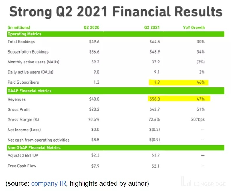 Duolingo 最近公布的第二季度收益是在 8 月份,标题收入为 5880 万美元,同比增长 47%。这是该公司自 7 月份 IPO 以来首次公布季度业绩。这里的故事要追溯到 2020 年疫情最严重的时候,当时该公司的用户大增,得益于 “居家” 主题。去年第二季度的 MAU 为 3790 万,比 2020 年同期下降了 3%。尽管如此,在两年的累积基础上,MAU 比 2019 年底增长了 39%。日活跃用户 “dau” 为 910 万,同比增长 2%,这是令人鼓舞的,因为这表明在大流行影响之外仍有持续的有机增长势头。