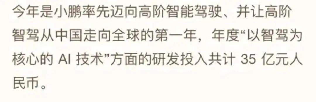 与小鹏汽车 CEO 何小鹏在节后复工第一周内部信提到的 “未来 3 年将发布 30 款全新或改款车型” 而引发的广泛关注相比,其对年度 “以智驾为核心的 AI 技术” 方面的研发投入共计 35 亿元的预计,可能更具 “杀伤力”。