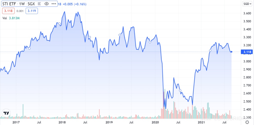 主要原因在于其每年 3.76% 的股息收益率。过去 5 年,STI ETF 平均价格并未发生显著改变。