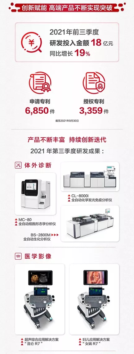正是这种灵感,转化成了 2021 年三季度昆仑 R7、MC-80 全细胞形态学分析仪等 7 款新产品研发成果,以及截至 9 月 30 日,6850 件申请专利,3359 件授权专利。
