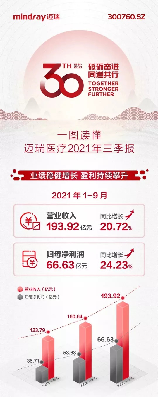 2021 年 10 月 19 日,迈瑞医疗发布了 2021 年三季度财报。193.92 亿元的营收,66.63 亿元的净利润,意味着公司分别收获了 20.72% 和 24.23% 的同比增长。