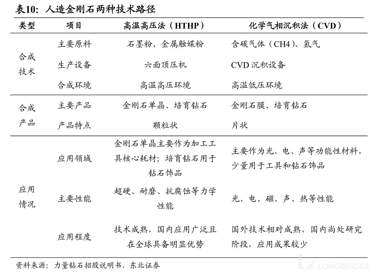 人造钻石的培育,主要有高温高压法 (HTHP)和化学气相沉积法 (CVD)两种工艺,其中高温高压法我国占据了全球 40% 左右的产能,这些企业主要分布在河南。