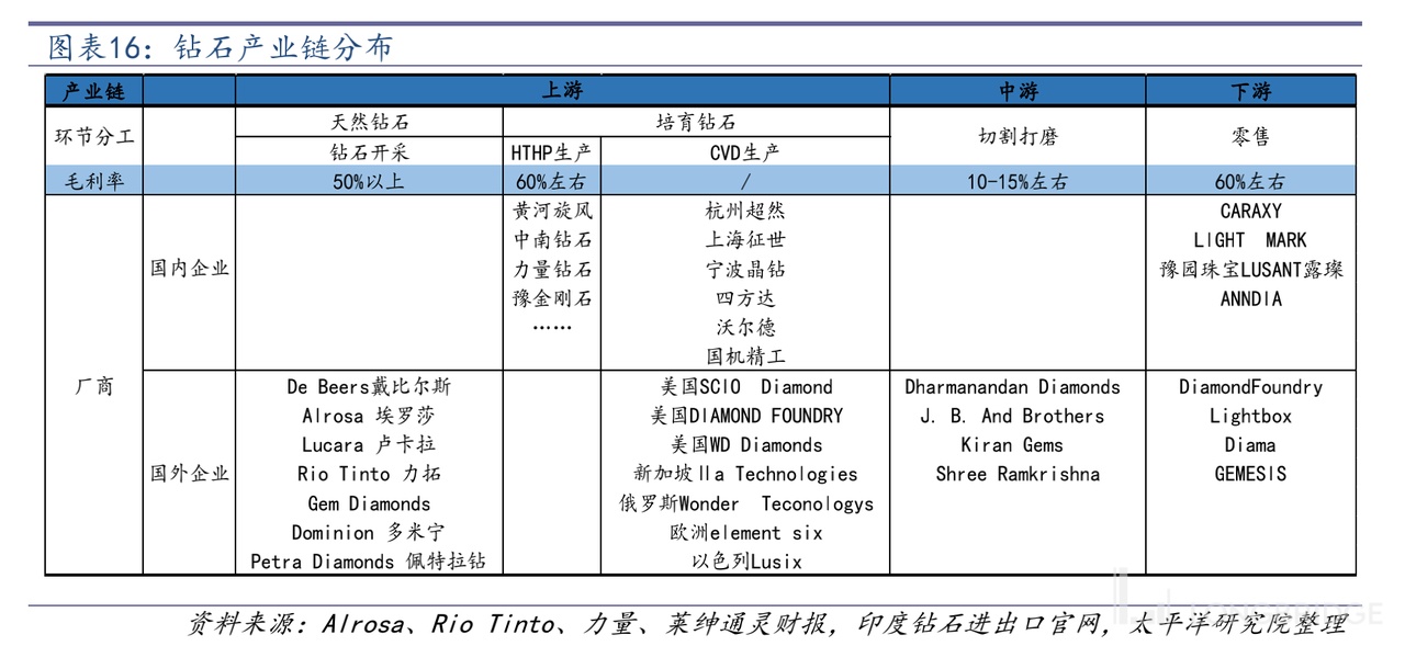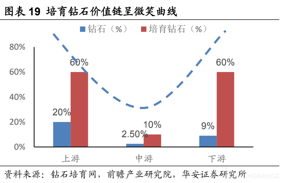 人造钻石产业链主要分为「钻石毛坯生产—>毛坯切割打磨、设计—>珠宝零售」三个环节。其中毛利率呈现微笑曲线的样式。