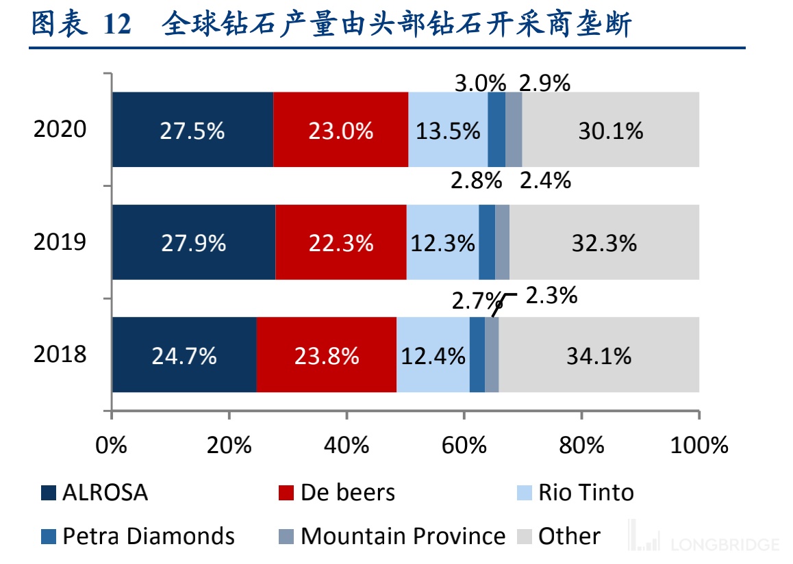 天然钻石的生产高度垄断,资源渐少难以满足终端需求。天然钻石的开采权被五家钻石开采商垄断,分别为: