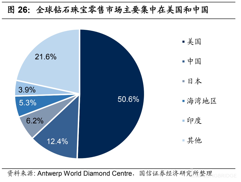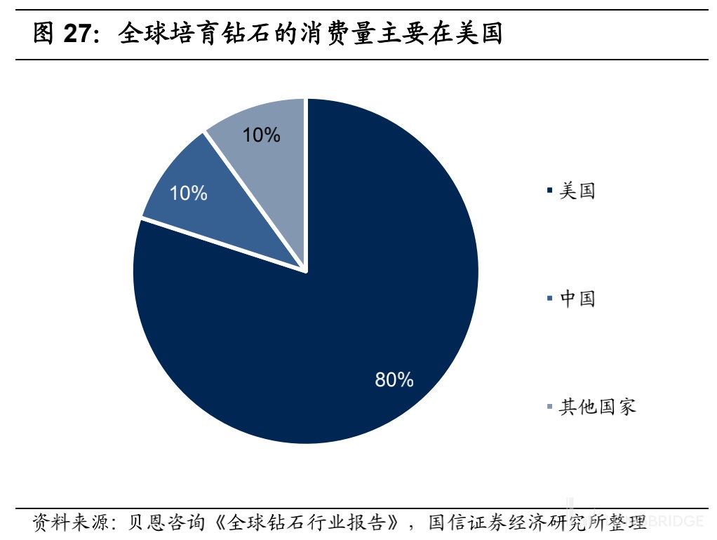 当前培育钻石的消费量 80% 在美国,中国是第二大消费市场。2020 年培育钻石渗透率仅约 6.31% 左右,渗透率低,但随着培育钻石产量的快速提升,渗透率有望得到提升。