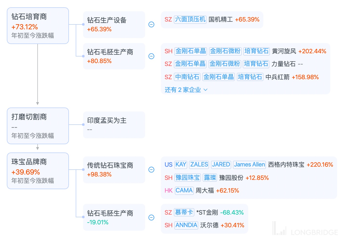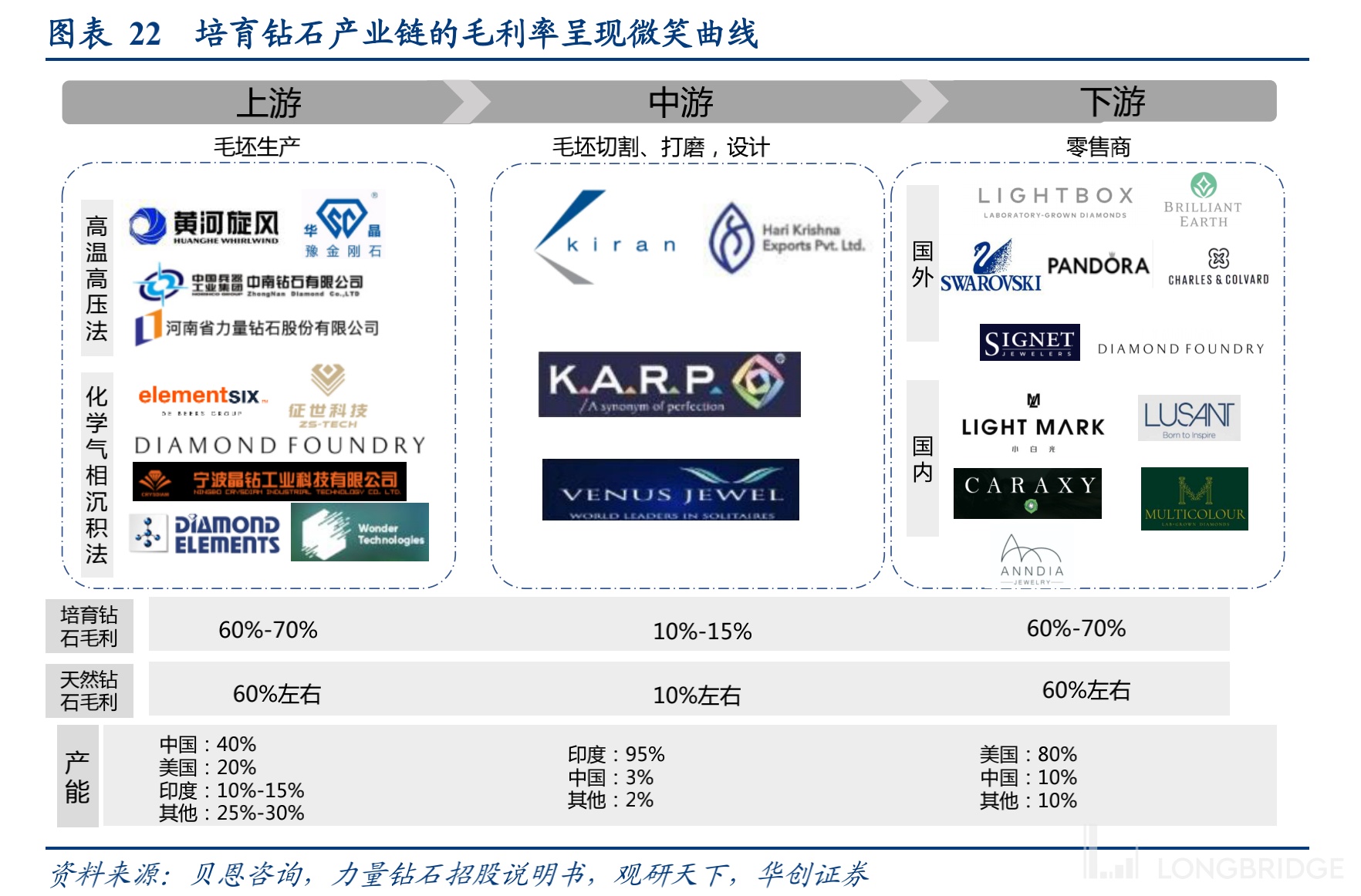 上游毛坯的培育以及下游的零售毛利率达到了 60% 左右,而中游的加工和设计,只有 10% 左右的毛利,主要分布在印度孟买地区。