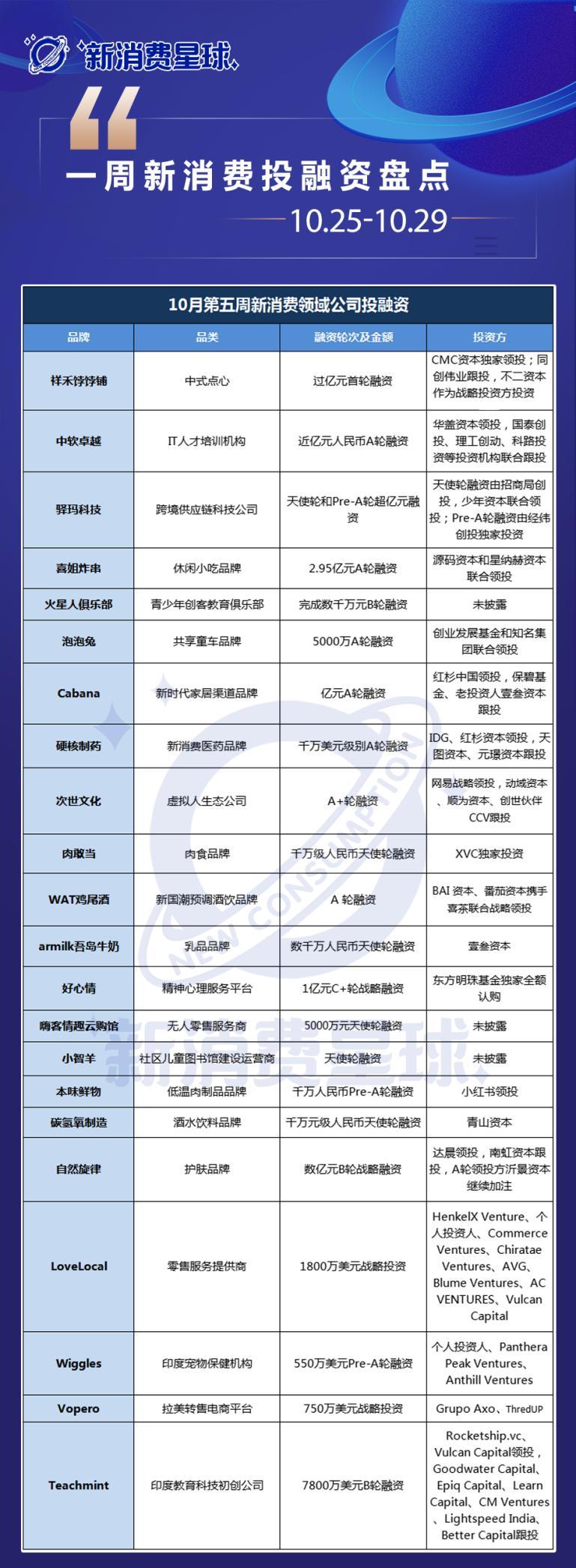 以下一周投融资复盘内容(10 月 25 日至 10 月 29 日)由新消费星球整理。
