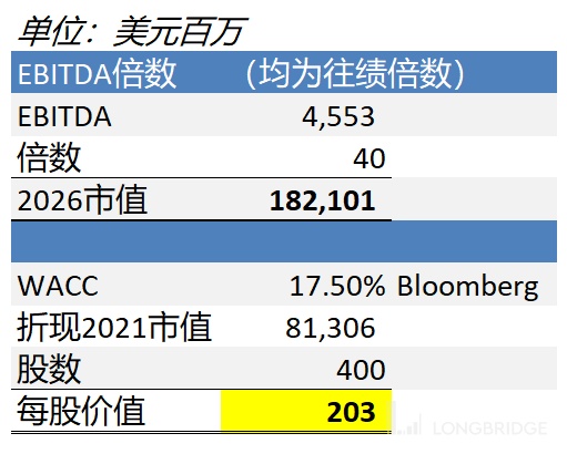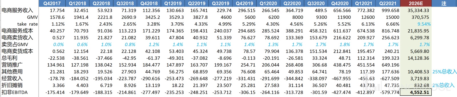 我可以拍 2030 年的 EBITDA,然后折现后基于一个成熟电商 20X 左右的 EBITDA,但是 2030 年的预测注定没有准确性可言。我决定用 40x 的 2026 年 EBITDA 来估值。请自行调整。