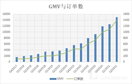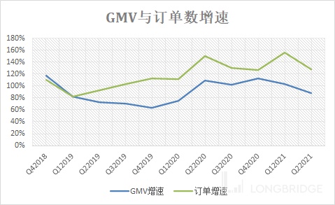上面两图可以看出虾皮的 GMV 和订单增速堪称恐怖。同比增速 GMV 长期在 70% 以上,订单增速更是过去 13 个季度稳定维持在 100% 以上。电商行业可能只有拼多多做到过这么亮眼的增速。