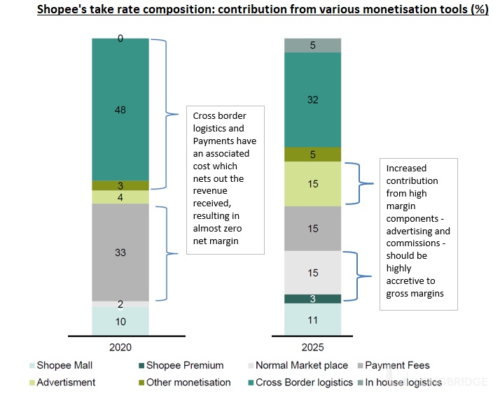 上图是券商 Bernstein 的报告中拆解的虾皮 Take rate 成分(左侧柱图,我们不看 2025 年的成分预测,我们下文自己拍)。可见 2020 年的虾皮服务收费 33% 来自支付,48% 来自物流,合共 81% 的收入都是零毛利的。其中市集佣金只占 2%(几乎免佣金),虾皮 Mall 的佣金也仅占 10%,广告收入只占 4%。佣金和广告两项有效可比收入加起来仅占 GMV 的 0.8%。即 2020 全年的电商服务有效 take rate (effective take rate) 只有 0.8%。如果跟我们熟悉的中国电商平台相比,只有佣金与广告收入纳入收入计算,所以我们也将这两项有毛利的收入纳入有效收入。其他零毛利的收入当做未来可以完全转嫁成本这个现实假设即可。