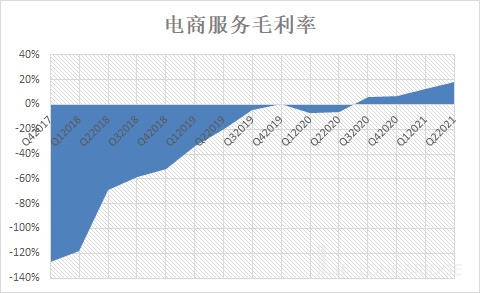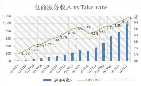 公司想要让投资者看到的是上面这幅图,蓝色线是推广费用占 GMV 的占比在持续下降,每笔订单的推广费用也在持续降低。然而,每家公司营销和推广的手段并不相同。上图的费用率下降并不等同于经营杠杆开始起作用了。因为虾皮的推广并不是砸钱,而是压根就不收费。没错,你看到下图的电商服务收入(非卖货收入,纯平台服务收入)和 Take rate 没有太大参考意义: