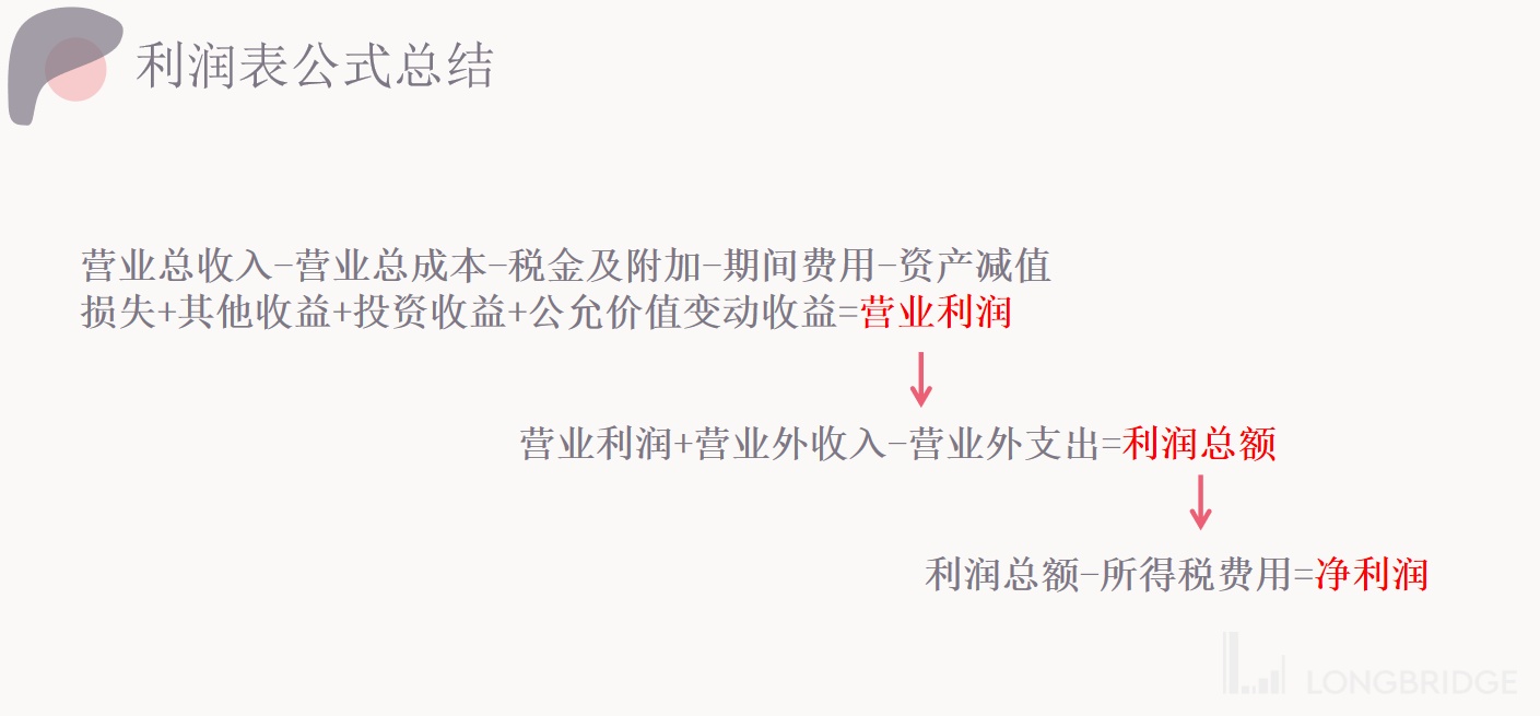 那么写到这儿,我们就把利润表 “从营业收入到营业利润” 和 “从营业利润到净利润” 的过程都了解完了。所以最后让我们来对这两个过程做个总结吧: