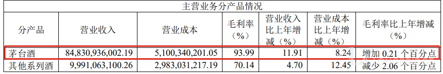 以贵州茅台为例,2020 年仅销售茅台酒的毛利率就高达 93.99%,比去年增加了 0.21 个百分点。和同年五粮液 84.95%、泸州老窖 83.52% 等酒企的毛利率相比,茅台超出其他酒企近 10 个百分点的超高毛利率也印证了它的地位。