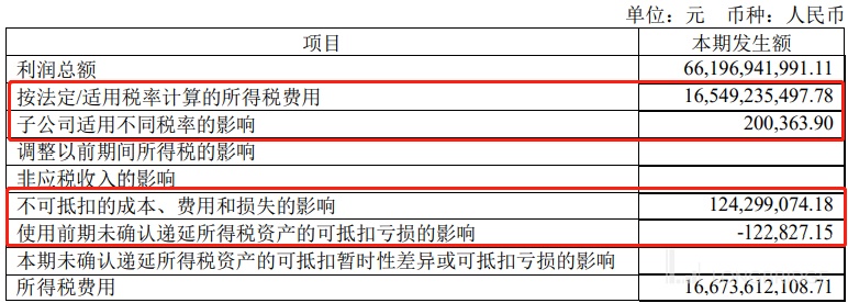 还是拿 2020 年茅台公布的年报来说,贵州茅台除了缴纳了 25% 的企业所得税,其中还涉及到了子公司适用的不同税率、不可抵扣的成本费用和损失,以及递延所得税资产的影响,最终共产生了 166.73 亿元的所得税费用。