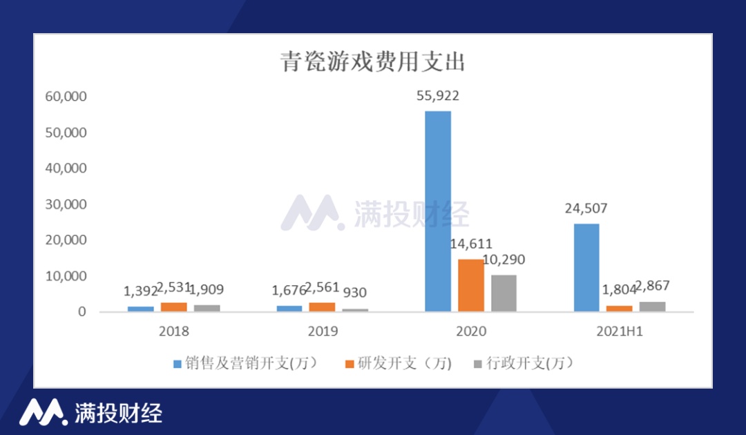 青瓷游戏的费用支出从 2018 年的 5832 万飙升至 2020 年的 8.08 亿元,其中营销费用从 1392 万元增长至 5.59 亿元,三年约增长了 40 倍,大力营销能够吸引新玩家,但每一款游戏都有生命周期,如何能够留存玩家并长期实现稳定的业绩增量,需要强化产品研发,提升产品质量,持续有规划地推出新游戏。但从费用支出的结构变化来看,自从青瓷游戏在作出《最强蜗牛》这款爆款游戏之后,似乎变得没有那么重视研发,而是将重点放在营销上面,研发跟营销的支出大相径庭,不禁让人质疑其是否还有推出下一个爆款的能力。