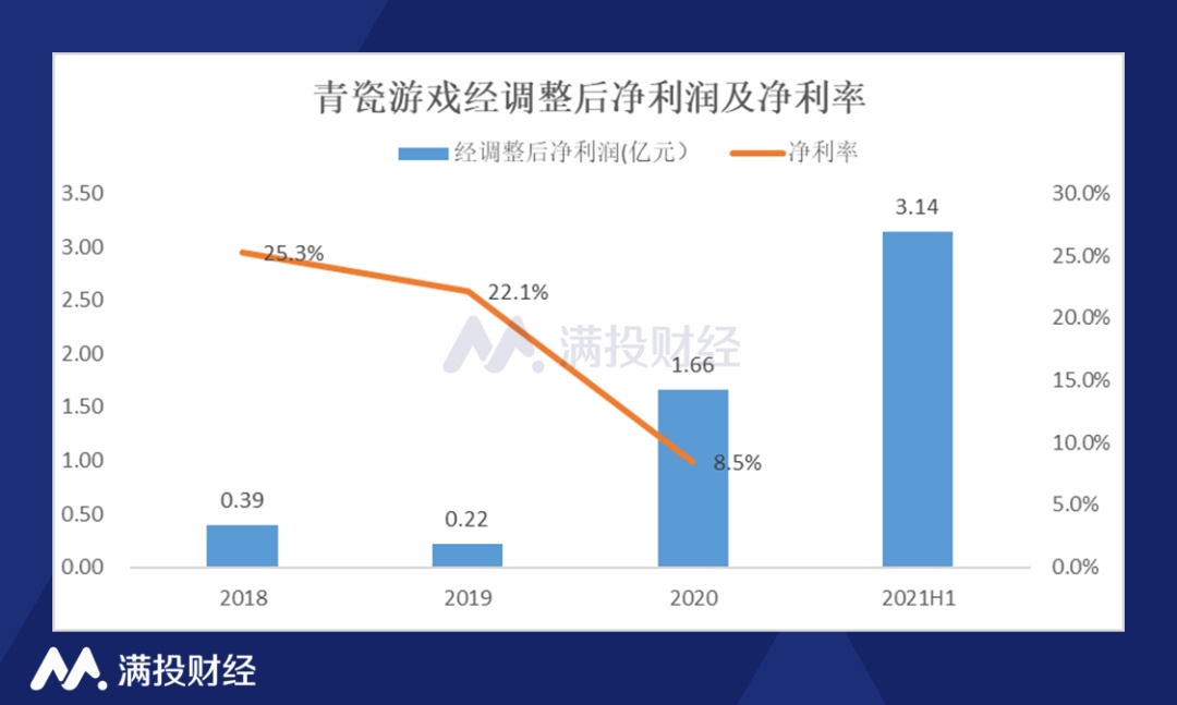 公司营收大幅增长的同时,经调整后净利润也大幅增加并实现转亏为盈,2018 年至 2020 年,青瓷游戏经调整后净利润分别为 0.39 亿元、0.22 亿元、1.66 亿元,2021 年上半年继续增长至 3.14 亿元,而 2020 年同期为亏损 1.44 亿元。