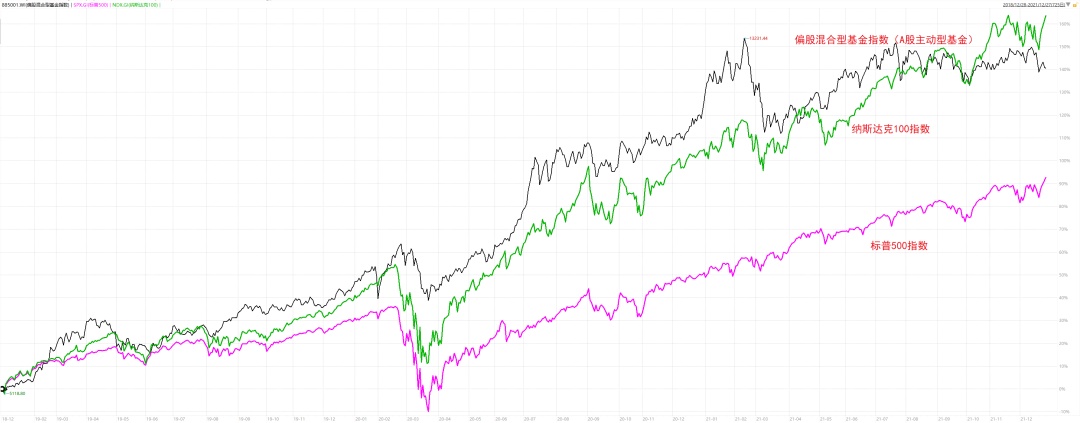 如果看偏股混合型基金指数(代表 A 股主动型基金平均数),过去三年主动型基金跟美股纳斯达克 100 指数不相伯仲,大幅领先标普 500 指数。而且这还是在过去一年美联储持续货币宽松,我们提前收紧并且对某些核心行业严监管的情况下。