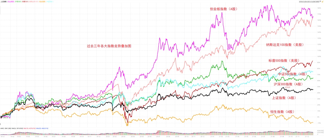 可以看到,创业板指数确实涨幅最大,三年累计涨幅约 165%。不过经过最近大半年的横盘震荡,创业板指数已经快被纳斯达克 100 指数追上了。