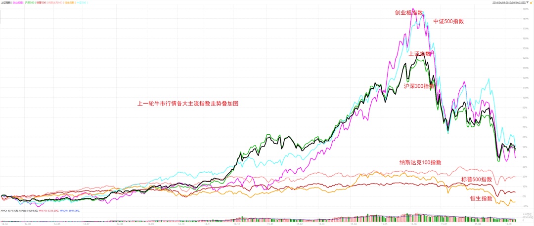 然后我们再来看上一轮牛市时,各大主流指数的涨跌幅情况。下图同样包含了创业板指数、中证 500 指数、沪深 300 指数、上证指数,还有美股的纳斯达克 100 指数、标普 500 指数还港股的恒生指数。