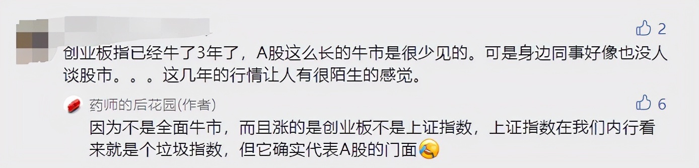 这位老朋友吐槽说,创业板指数已经连续上涨 3 年了,A 股这么长的牛市是很少见的,但是身边同事好像也没人谈股市,不像 2015 年那时候,这几年的行情让人有很陌生的感觉。PS:不知道其他朋友有没有类似的想法。