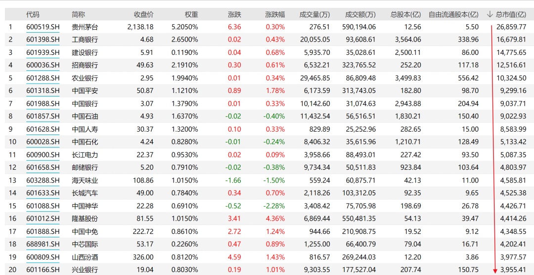 再来看下图,是我们 A 股上证指数的前 20 大权重股(按总市值排行)
