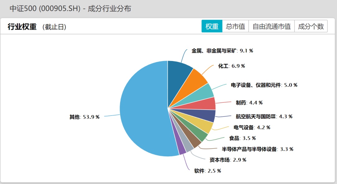 港股的同志先往后稍稍找包纸巾擦一下眼泪。我们接着看为什么创业板可以成为两轮牛市的男主角,而中证 500、沪深 300、上证指数为什么只能当配角了?这是道德的沦丧还是人性的扭曲?都不是,是指数行业权重的问题。