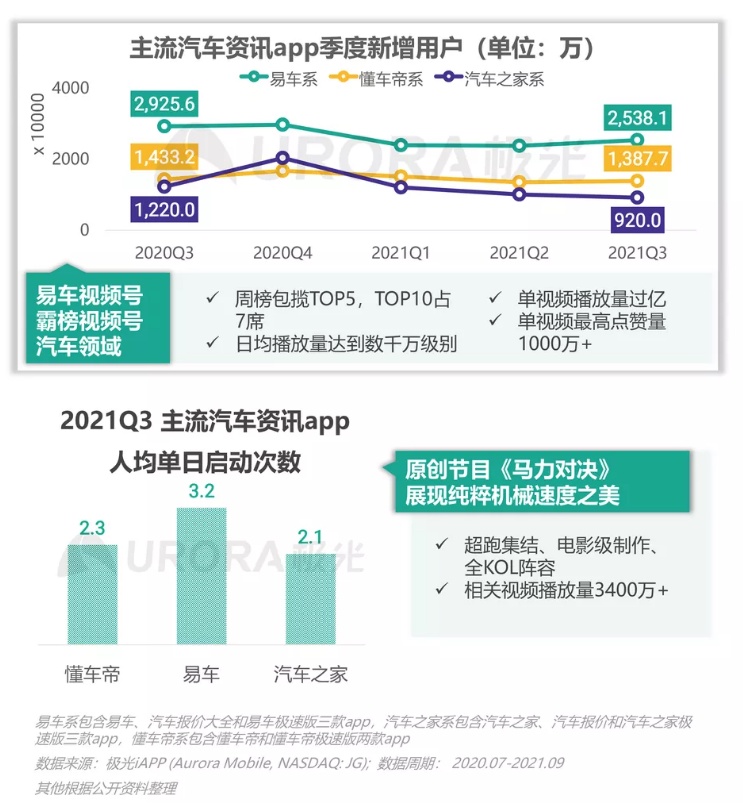 再看分析,“易车系” 马太效应显著,新增用户数是 “懂车帝” 和 “汽车之家” 的总和,易车系能保持高速的用户增长,动力来源于其高质量的原创内容,懂车帝也有自己的内容矩阵,但两者的线路却不尽相同。
